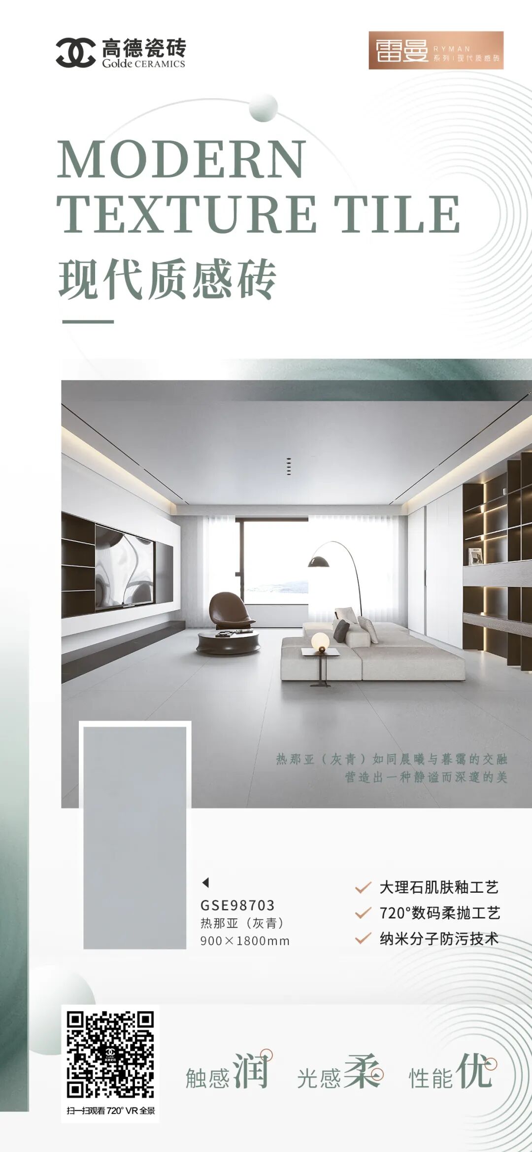 PRODUCT:GSE98703热那亚(灰青)SIZE:900×1800MM💫GSE98703热那亚(灰青)如同晨曦与暮霭的交融,营造出一种静谧而深邃的美。🏠唤醒生活格调✅纯色 ✅轻纹 ✅ 简素✅触感润 ✅光感柔✅ 性能优🔬匠心独运,质感非凡☑️大理石肌肤釉工艺☑️720°数码柔抛工艺☑️纳米分子防污技术#雷曼系列丨现代质感砖 #唤醒生活的格调